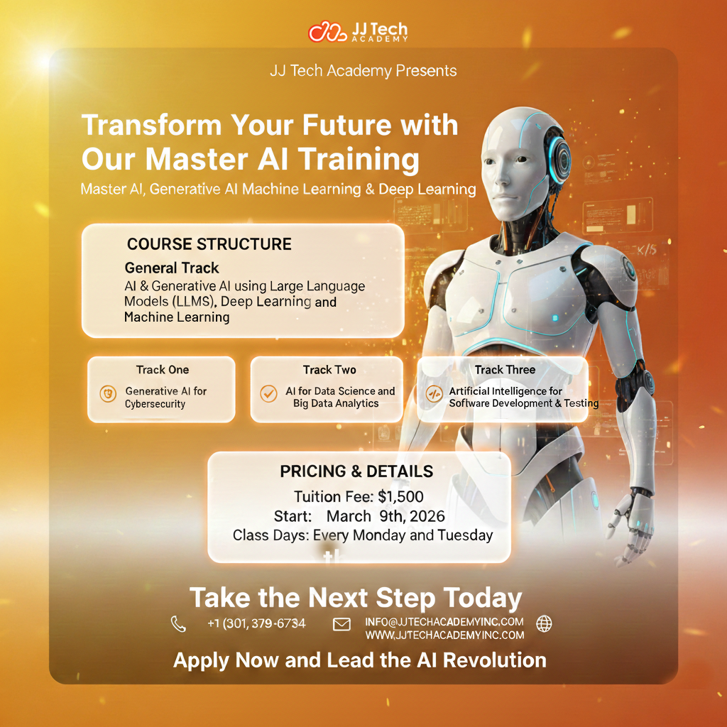 Welcome to JJ Tech Academy. Our academy is dedicated to providing top-notch training in AWS, DevOps, Azure, Artificial Intelligence, Data Science Agile Scrum, and more. Whether you’re a beginner looking to break into the tech industry or a seasoned professional aiming to upskill, our expert instructors and comprehensive courses are tailored to meet your needs. Here, we believe in a hands-on, practical approach to learning, ensuring you gain real-world experience with industry-standard tools and methodologies. Join our vibrant and supportive learning community, where collaboration and innovation thrive. We’re committed to helping you achieve your career goals and unlocking your full potential.